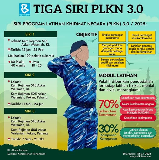 Info lanjut berkaitan Program Latihan Khidmat Negara 3.0 (PLKN):https://www.mod.gov.my/index.php/en/information/plkn-3-0;